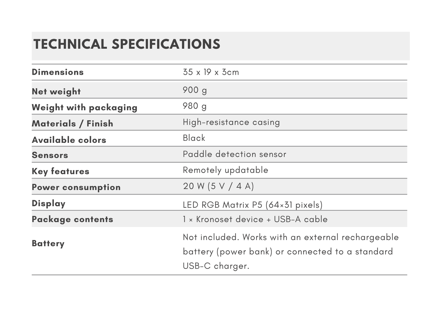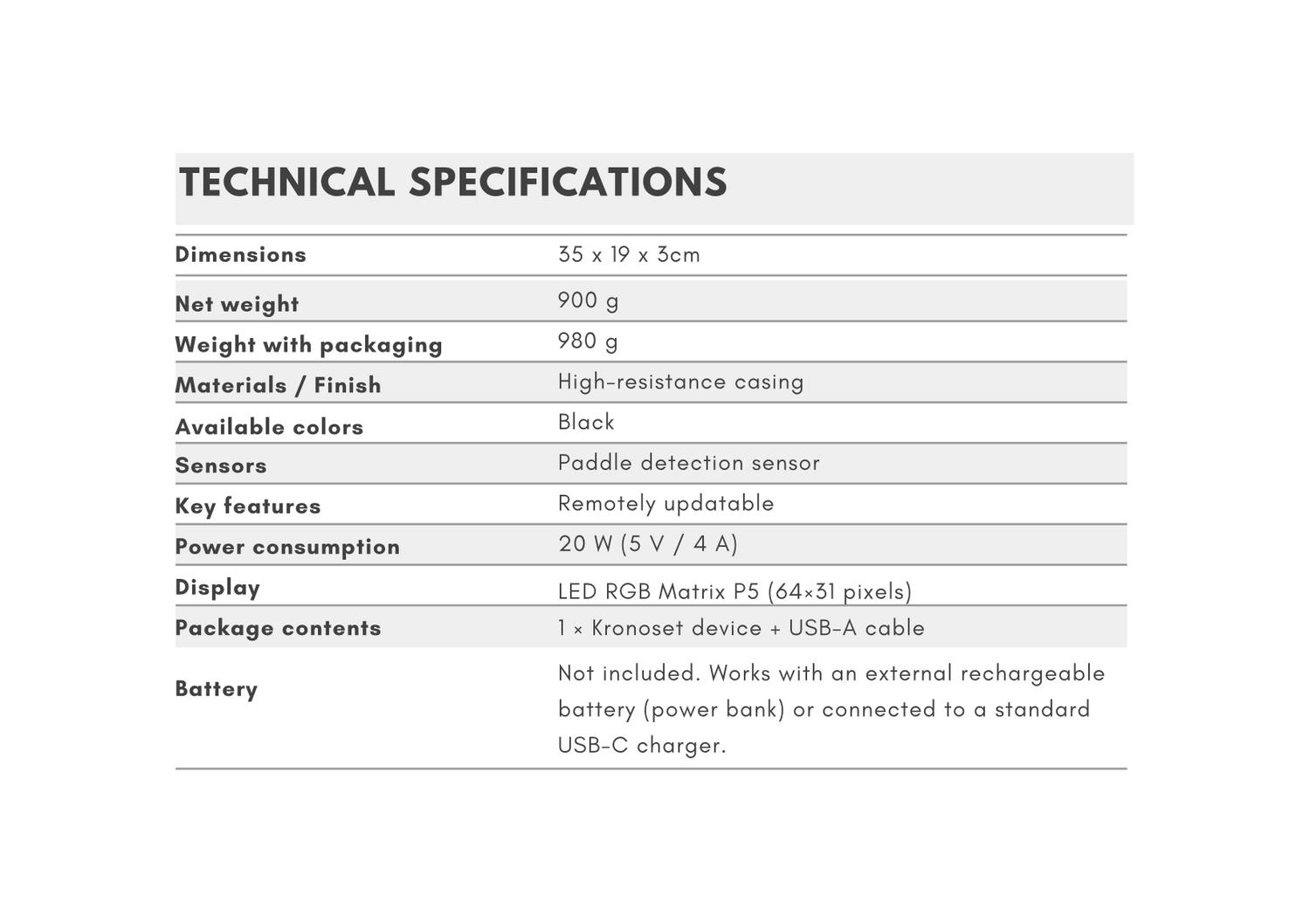 Designed for clubs and players looking for agility and zero distractions, Kronoset X1 integrates a proximity sensor and a high-visibility LED display so the scoreboard can be controlled directly from the racket. A compact and durable body makes it easy to set up and transport between courts.